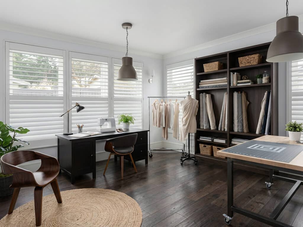 - Norman Shutters: Norman shutters are a smart choice for home offices because they add insulation and help maintain a comfortable indoor temperature. With the award-winning InvisibleTilt® split tilt feature, you can close only part of the louvers to block glare while still letting natural light in. This balance of energy efficiency and light control helps create a more comfortable, productive workspace.