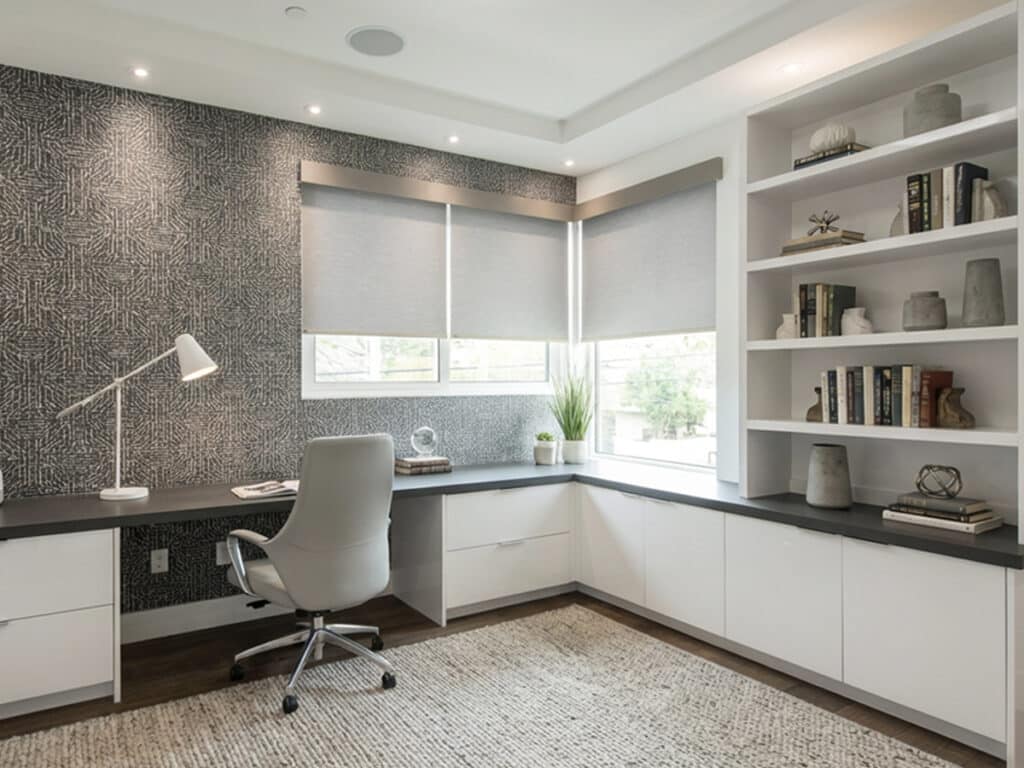 Modern home offices benefit from window treatments that are easy to adjust and visually unobtrusive. Motorized window treatments allow quick changes in light control throughout the day.